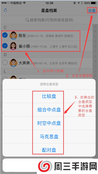 2、或者进入星盘档案页面,选择两个档案,点击右上角的“合盘”按钮,在弹出的合盘类型中选择需要的合盘类型