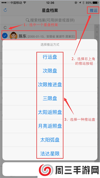 参考上面对应的“如何进行排合盘”流程,只不过在星盘档案页面,静静选择一个档案即可