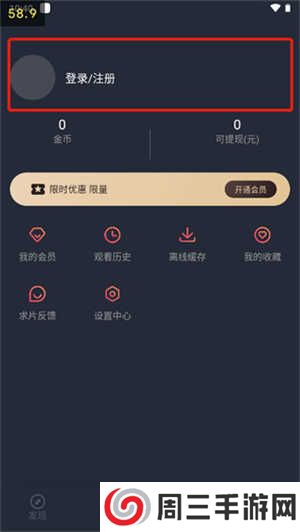 1.进入之后我们首先在【我的】页面,点击登录/注册,才能观看影片。