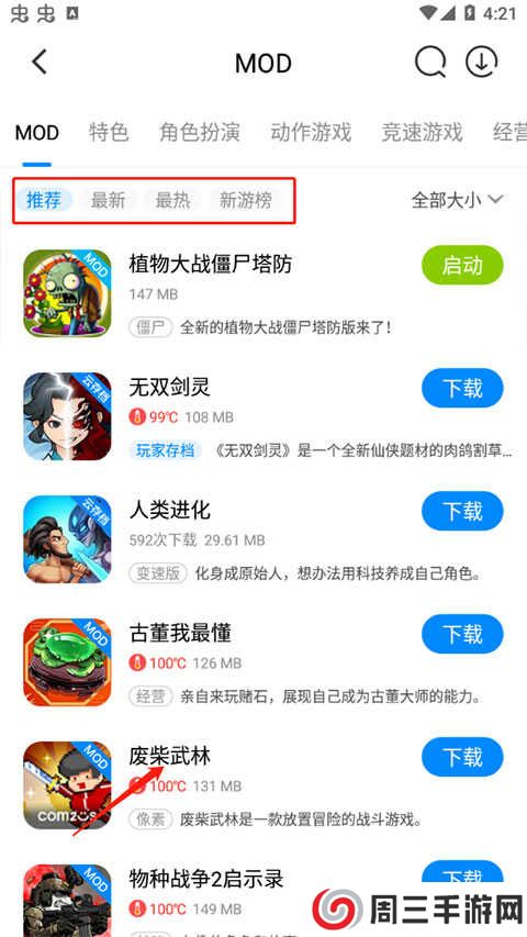 2、这里有着当下最新、最热、新出游戏等不同分类,我们以下载废材武林为例子