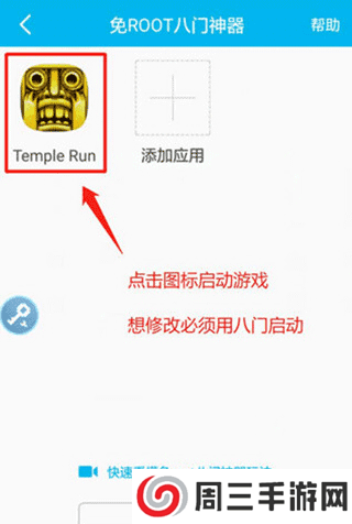 2、添加游戏“神庙逃亡”之后,点击图标启动游戏。记住,一定要在八门内使用修改器启动才能生效;