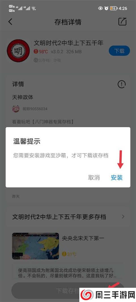 3、这个时候可以看到下载存档是灰的,点击提示需要玩家安装至沙盒,点击安装。